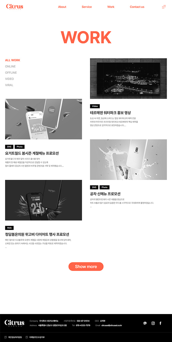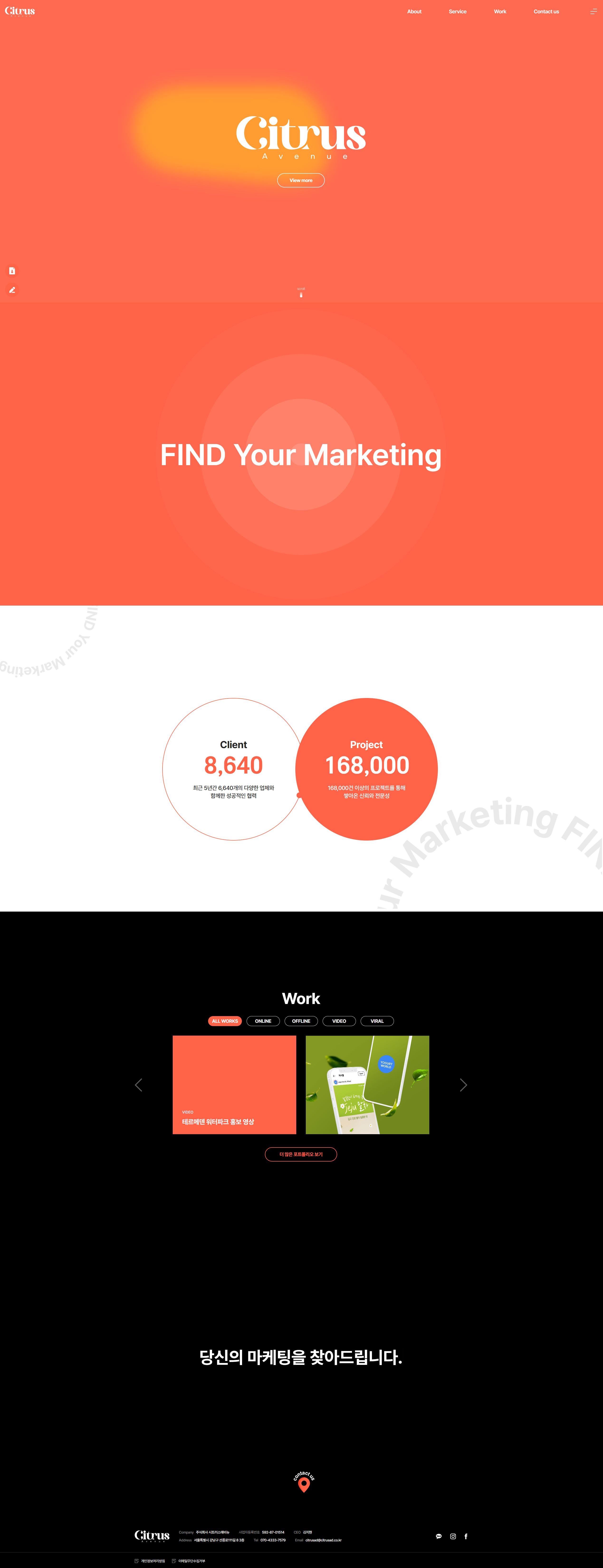 다양한 애니메이션 기법을 활용하여 시트러스애비뉴가 추구하는 마케팅 포인트를 제시함으로써 고객이 추구하는 니즈를 파악하는 데에 용이하도록 하였고, 포트폴리오를 제공할 때에는 이미지를 중심으로 타이틀과 정보를 함께 보여주어 관심을 유도할 수 있게 제작되었습니다.
