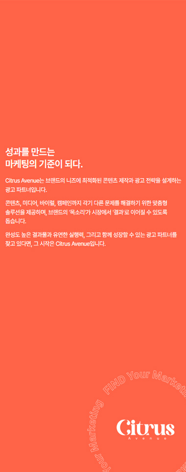 Citrus Avenue는 브랜드의 니즈에 최적화된 콘텐츠 제작과 광고 전략을 설계하는 광고 파트너입니다.